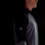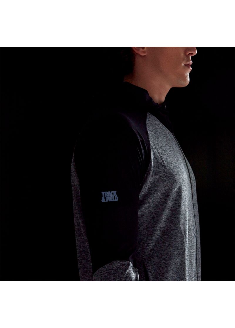 Poliéster e elastanoCombinação do tecido mescla com pretoLogo refletivo preto na manga direitaCapuzBolsos lateraisZíper frontal descartável