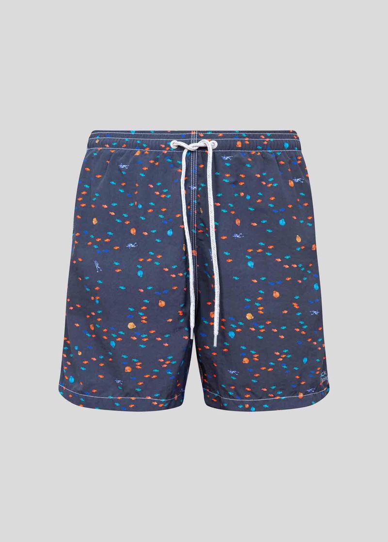 Possui cós com elástico e cordão regulador com ponteiras emborrachadasO modelo conta com bolsos laterais, bolso interno para pequenos objetos e bolso traseiro com fechamento em velcroEstampas exclusivas e tecido com secagem rápida