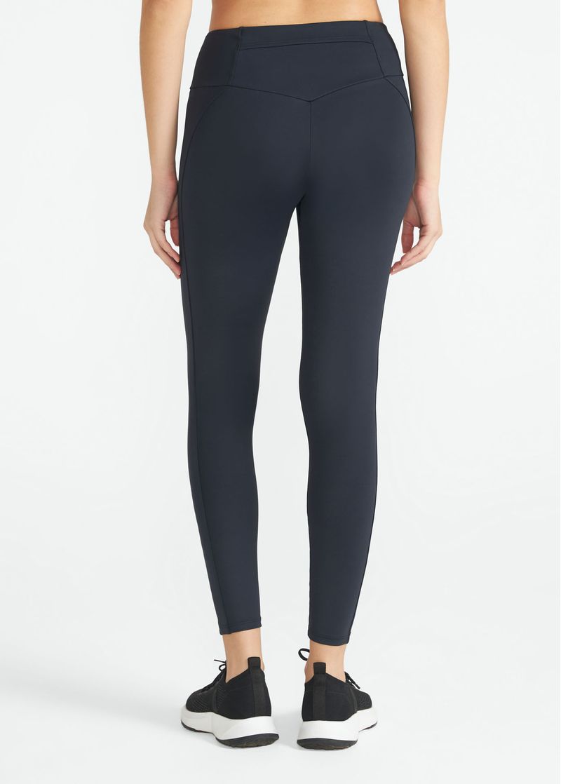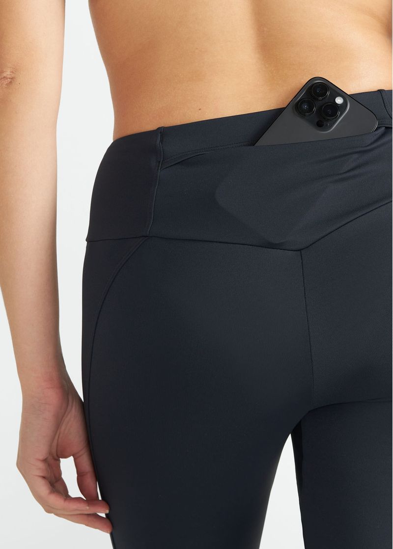 A Legging Feminina Studio preta possui cós alto, recortes anatômicos que valorizam o corpo e bolso traseiro sem zíper, garantindo praticidade com leveza e conforto.