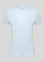 Decote redondo e modelagem retaRecortes laterais que modelam o corpo Detalhes na lateral e costas em tecido que simula uma telaPeça na cor água e com recortes contratantes na cor citrus Logo na cor coral
