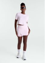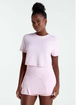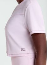 A Camiseta Feminina Manga Curta Recortes possui modelagem cropped e design moderno. Apresenta recortes assimétricos com costuras contrastantes que valorizam o visual, além de logo Track&Field aplicada na parte frontal.