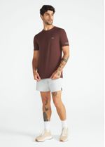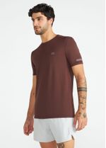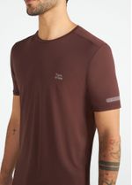 Camiseta masculina manga curta com decote redondo, cava tradicional, costura do ombro deslocada para valorizar a região do trapézio, tecido leve com textura, toque gelado e detalhe na manga e logo refletivos.