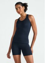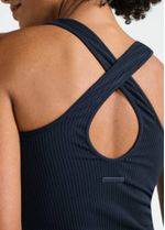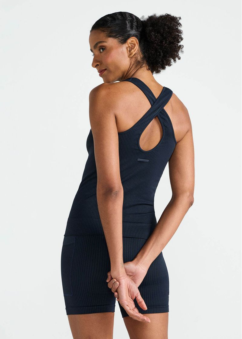 As alças largas cruzadas nas costas proporcionam melhor sustentação, enquanto as texturas localizadas ajudam a moldar a silhueta com caimento impecável. A construção com menos costuras reduz atritos e eleva o conforto durante a prática.