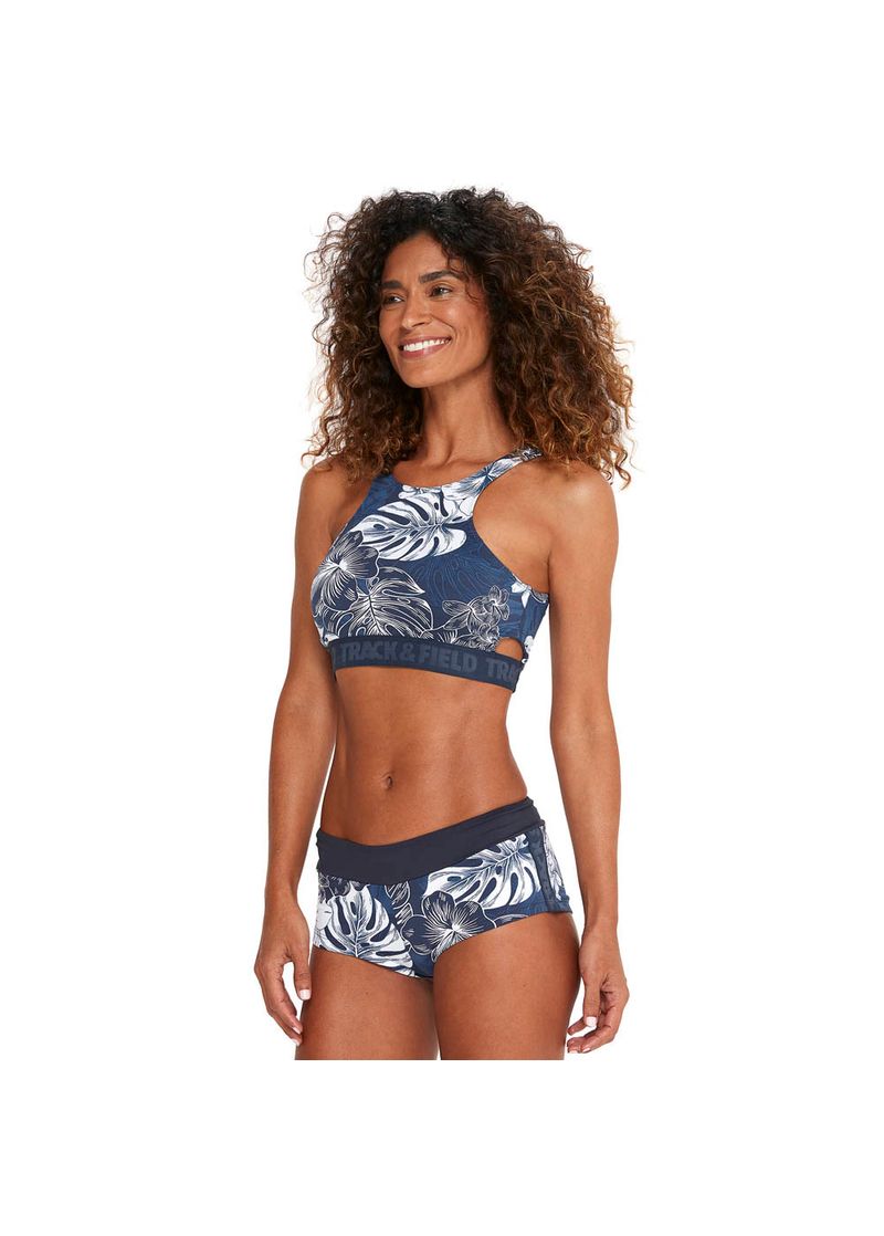 Top Aberto Maresia, o modelo da peça é feito em poliamida e elastano, com bojo interno removível e uma pequena abertura na parte posterior. Possui elástico com logo Track&Field, abertura em zíper nas costas e é perfeito para bustos médios e grandes.