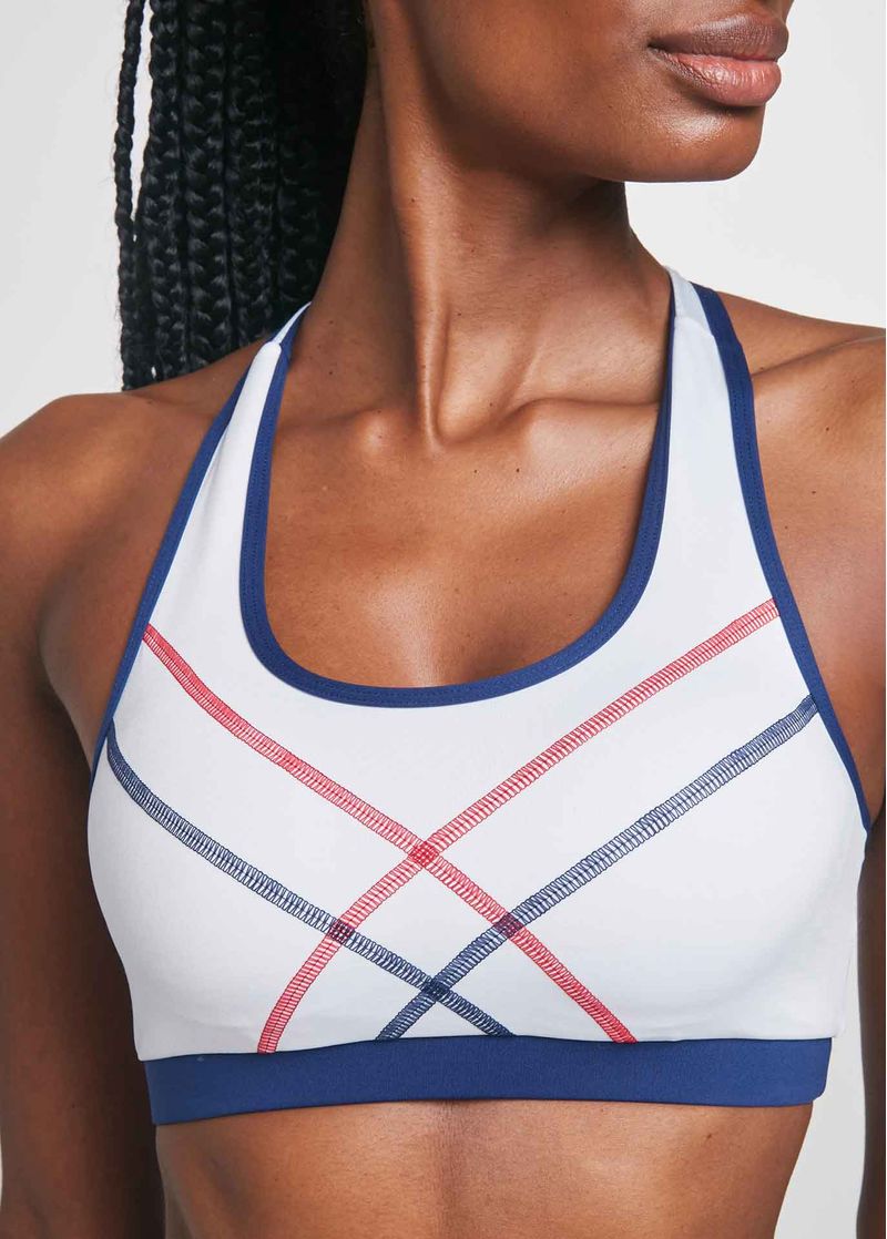 Possui bojo fixo para mais sustentação e decote redondoCom costas no estilo nadador e detalhe vazado nas costasConta com elástico para maior conforto e segurança durante a prática esportivaDetalhe em costuras contrastante na parte da frente do topA peça possui mix de cores exclusivas Track&Field: Guará e Mar