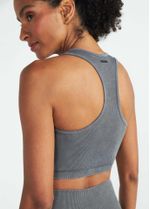Top de baixo impacto com pontos canelados, decote em V frontal e costas em estilo nadador. O acabamento das cavas e do decote em viés confere acabamento limpo e conforto. Com lavagem especial que proporciona aparência estonada, disponível : rosa malva e verde cinzento. Desenvolvido com tecnologia Seamless® em máquinas circulares especiais, reduz o número de costuras, oferecendo mais conforto, liberdade de movimento, alto poder de compressão e excelente maleabilidade. Parte visual: plaquinha de metal com logo Track&Field nas costas.